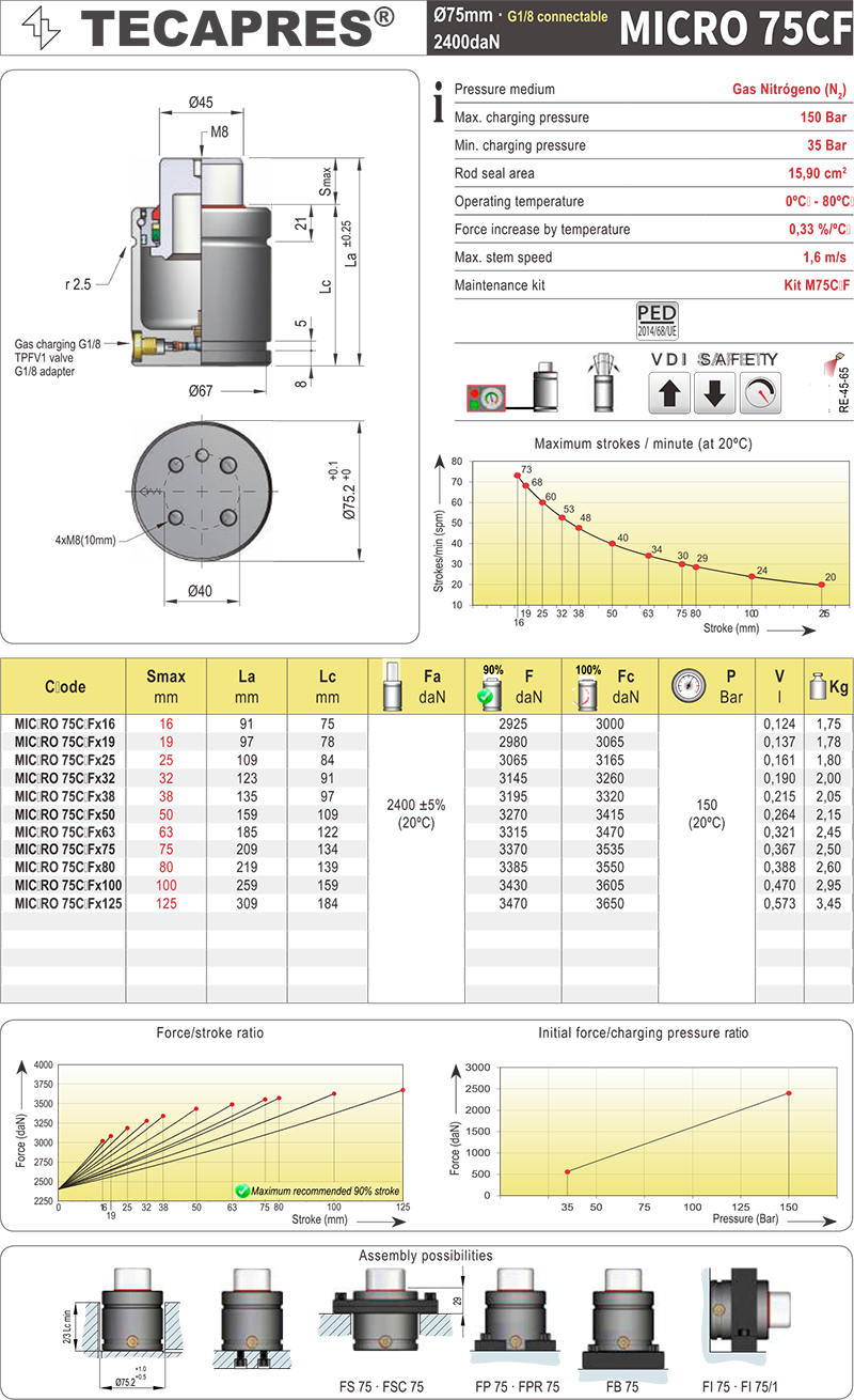 产品参数选购 TECAPRES 氮气弹簧 MICRO 75CF